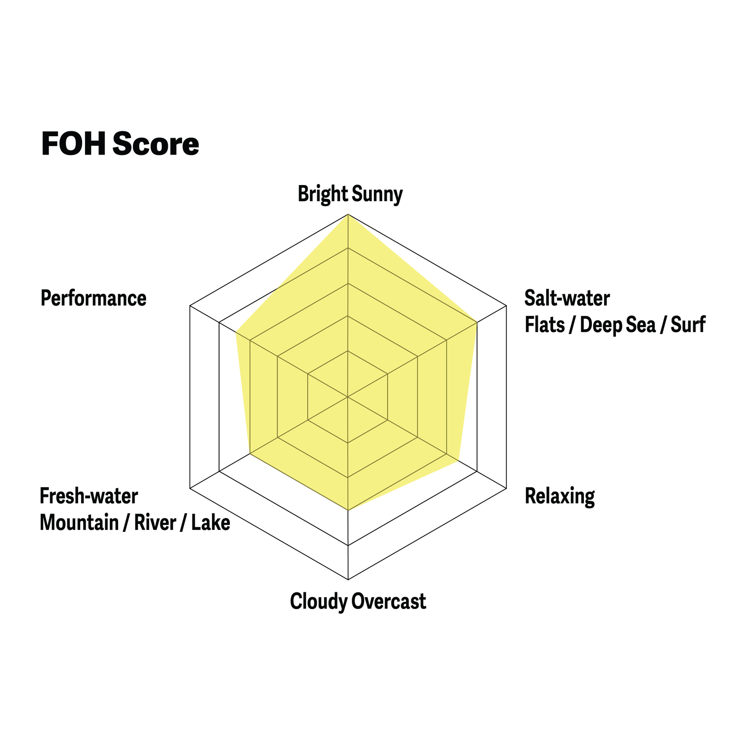 FOH Score helps you choose the right hat for your fishing adventure. Pick the hat that lets you thrive in the fishing environment whether it's a familiar local spot or uncharted territory. The hexagonal scoring is based on the hat's structure, material and colorway.